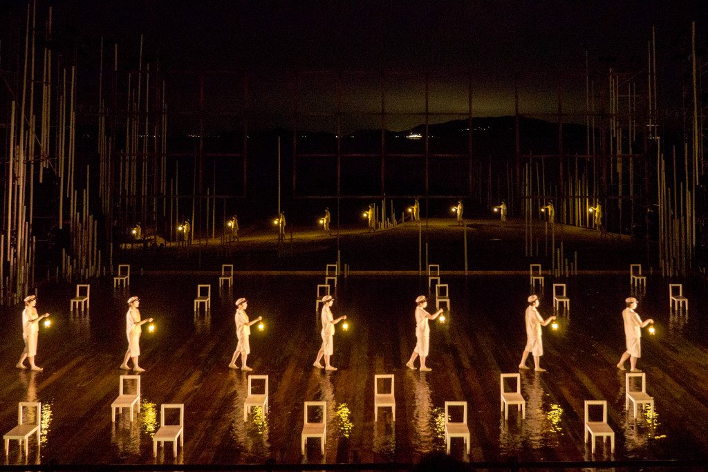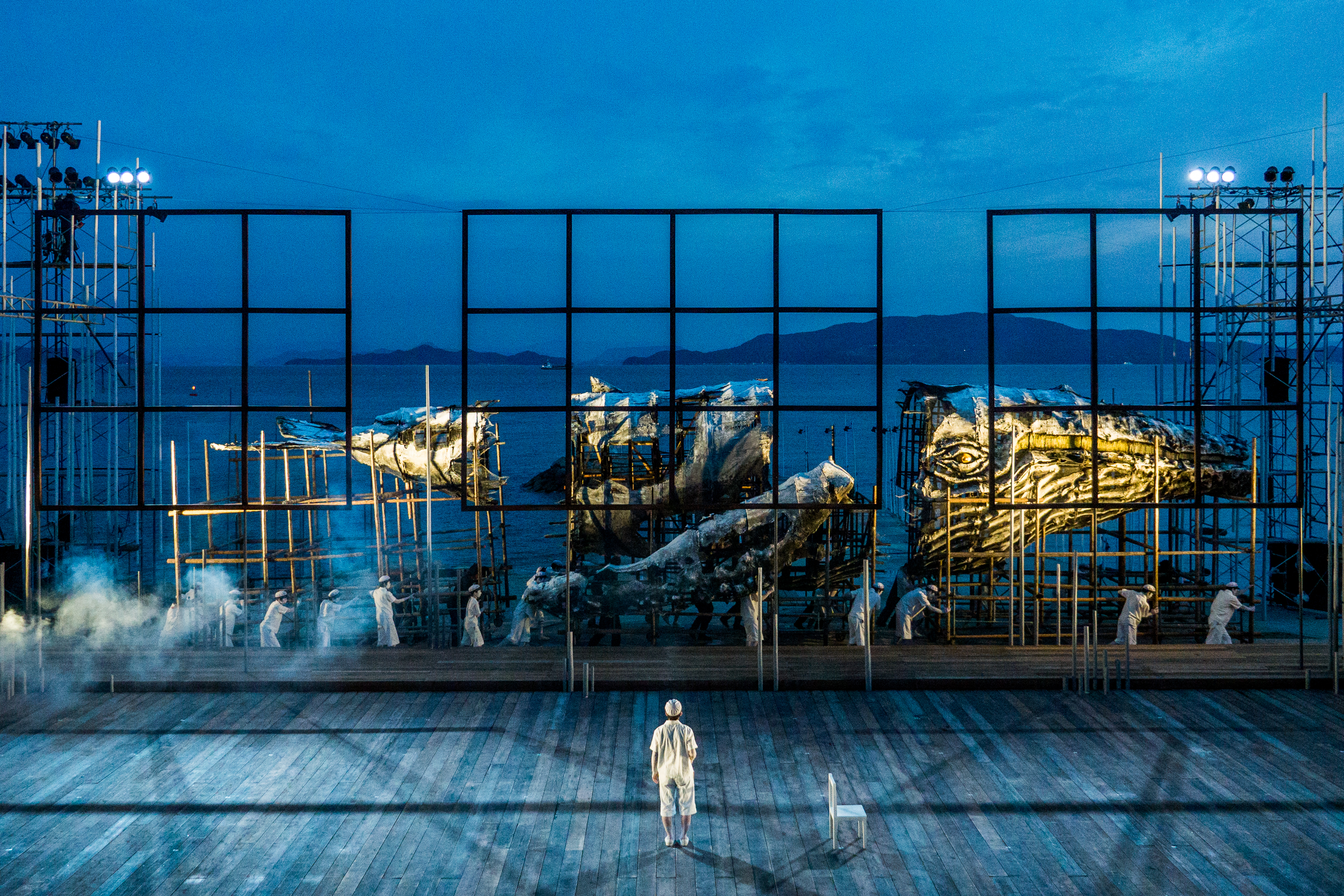 本作で4度目となる犬島での公演。今回の会場は、背景に豊島や小豆島、屋島、果ては高松まで、瀬戸内海を望む浜辺で行いました。