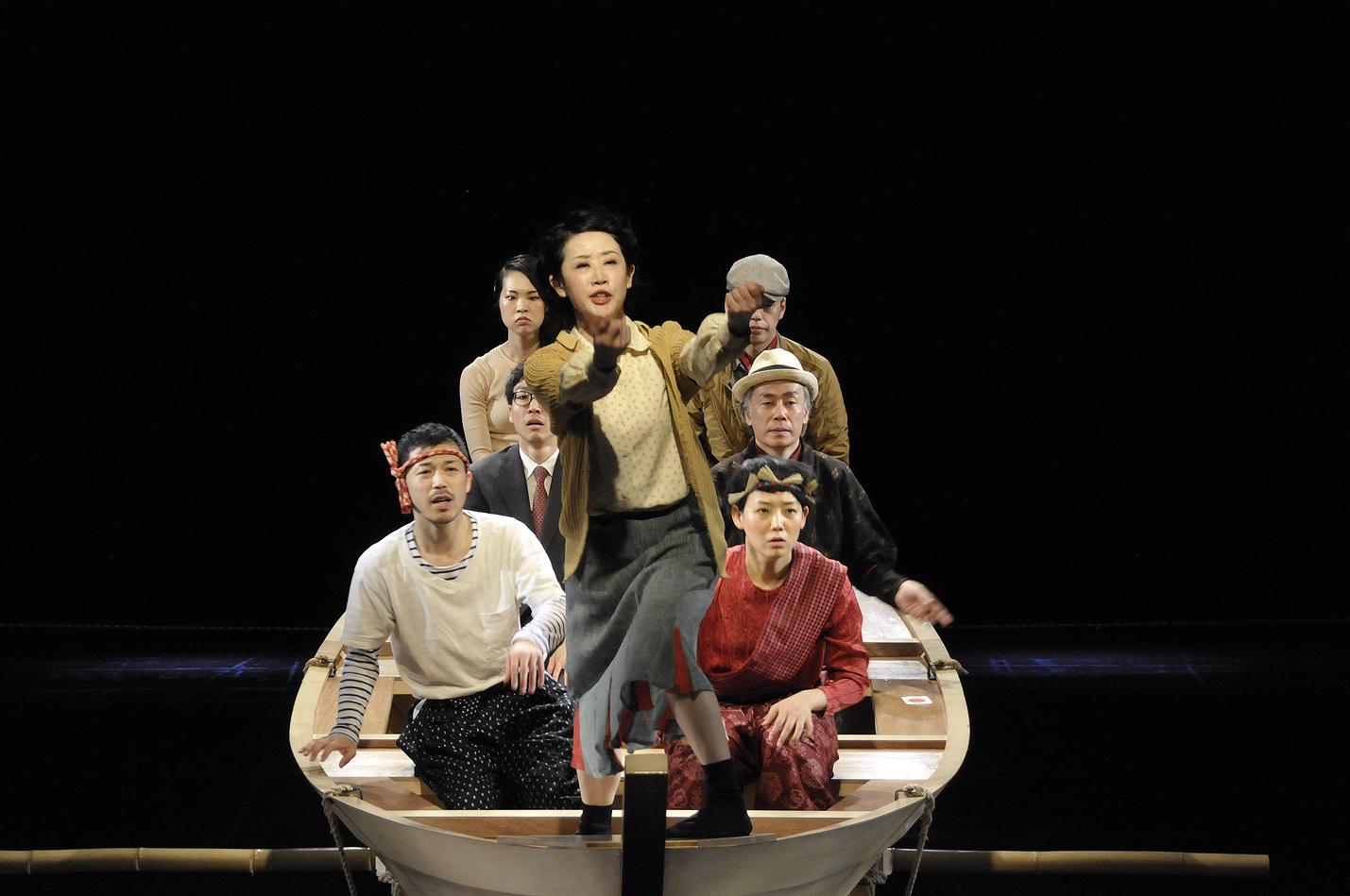 松原俊太郎による現代日本のフォークロア。舞台中央には一艘の舟。漁師、サラリーマン、女子高生…と様々な「日本人」が現れ、奇妙な共同体は舟に乗り込むーー。行き場を求めて右往左往する人々の姿は、不思議と深刻さからは無縁であり、祝祭空間としての劇場を強く意識させる。震災以降の日本社会に対する痛烈な批判でありながら、死者とともにあること、忘却についての哲学的論考を含む原作を一幕に再構成、地点の新しい境地を拓いた。