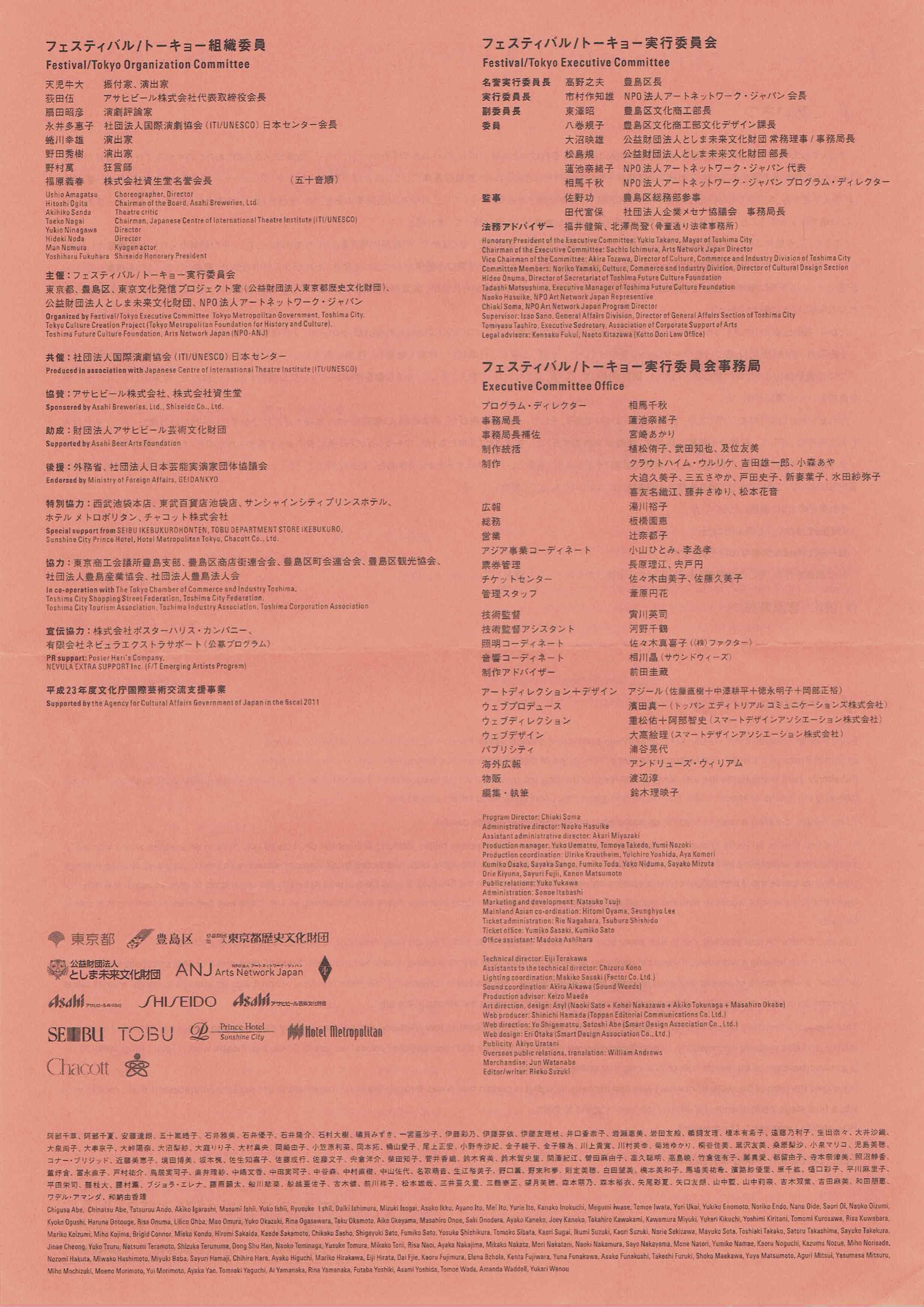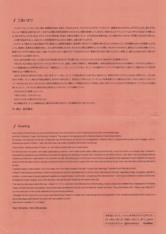 「3.11以後の生活」を捉えるため、宮沢童夫が引いた補助線は「1986年の東京」だった。アイドル歌手の飛び降り自殺が盛んに報道され、チェルノブイリ原発事故が世界を震憾させた年の夏、屋上でビンゴゲームに興じる人々の姿は享楽的なようで、どこか乾いた虚無感をも漂わせる。その様子を眺めるのは、「欠落の女」「忘却の灯台守」、そして2011年に生きる映画学校の生徒たち。彼らの視線、撮影された映像をたどりつつ、観客は「私たちは何を忘れたか(忘れようとしているか)」という問いを反錫する。終幕、舞台上に並べられた数々の生活用品、どこからか聞こえてくる日常会話や3.11をめぐる咳きの数々は、私たちの「欠落」のモニュメントでもある。(F/T11:Documentsより転載)