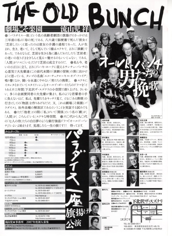 2006年、90歳の戌井市郎(文学座代表)を座長に、青年劇場の瓜生正実、本多一夫、岩淵達治、観世栄夫、中村哮夫、肝付兼太といった平均年齢80歳のメンバーで高齢者劇団=パラダイス一座を旗揚げ。美術:妹尾河童、音楽:高橋悠治、宣伝写真:荒木経惟の豪華スタッフ。作:山元清多(黒テント)、演出:流山児祥の劇作は、「七人の侍」の登場人物よろしくの銀行強盗団が繰り広げる荒唐無稽のアクションコメディ。NHK劇場中継も行われるほどの空前の大ヒット。パラダイス一座はその後、5年間上演活動を続けた。