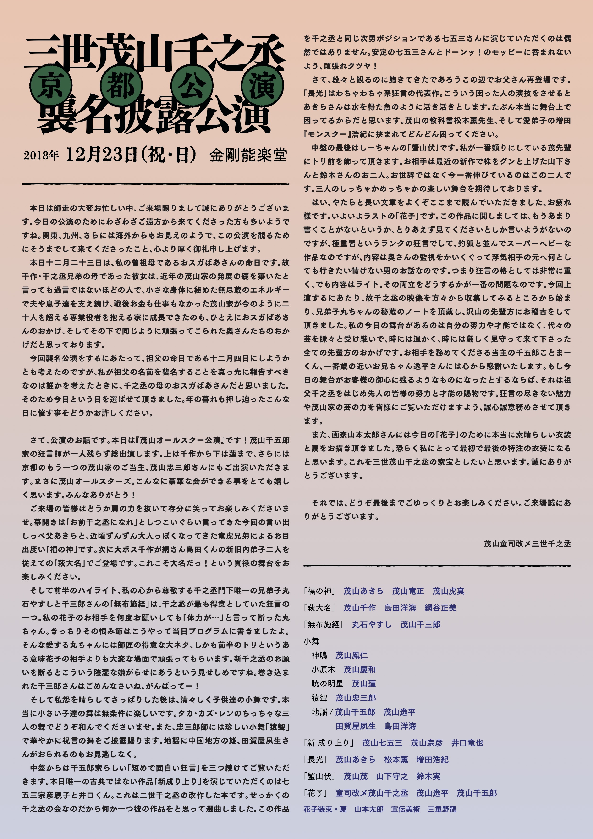 大蔵流狂言方茂山童司が三世千之丞襲名の際に演じた狂言。「花子」は特に演じるのが難しいとされ「披き」として初めて演じる際には大切に扱われる演目。