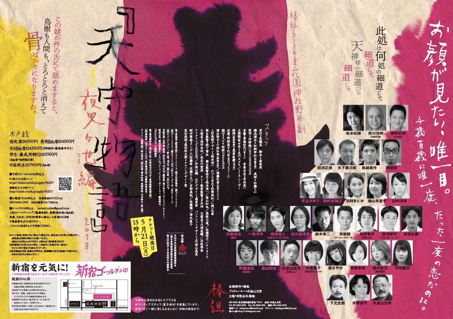 椿組の前身「はみだし劇場」時代の1996年(26年前)同じく花園神社で上演した野外劇を再構成し、泉鏡花物お得意の花組芝居の加納幸和が演出したスペクタクル編。小劇場界の強者が集い魑魅魍魎の怪奇世界を大胆に、花園神社の土の舞台に華咲かせます!「天守物語」と「夜叉ケ池」のいいとこ取り。そこに泉鏡花の少年時代も加味させ独特の世界を展開させます。脚本は今は亡き高取英の耽美な世界が華開きます。松本紀保主演!