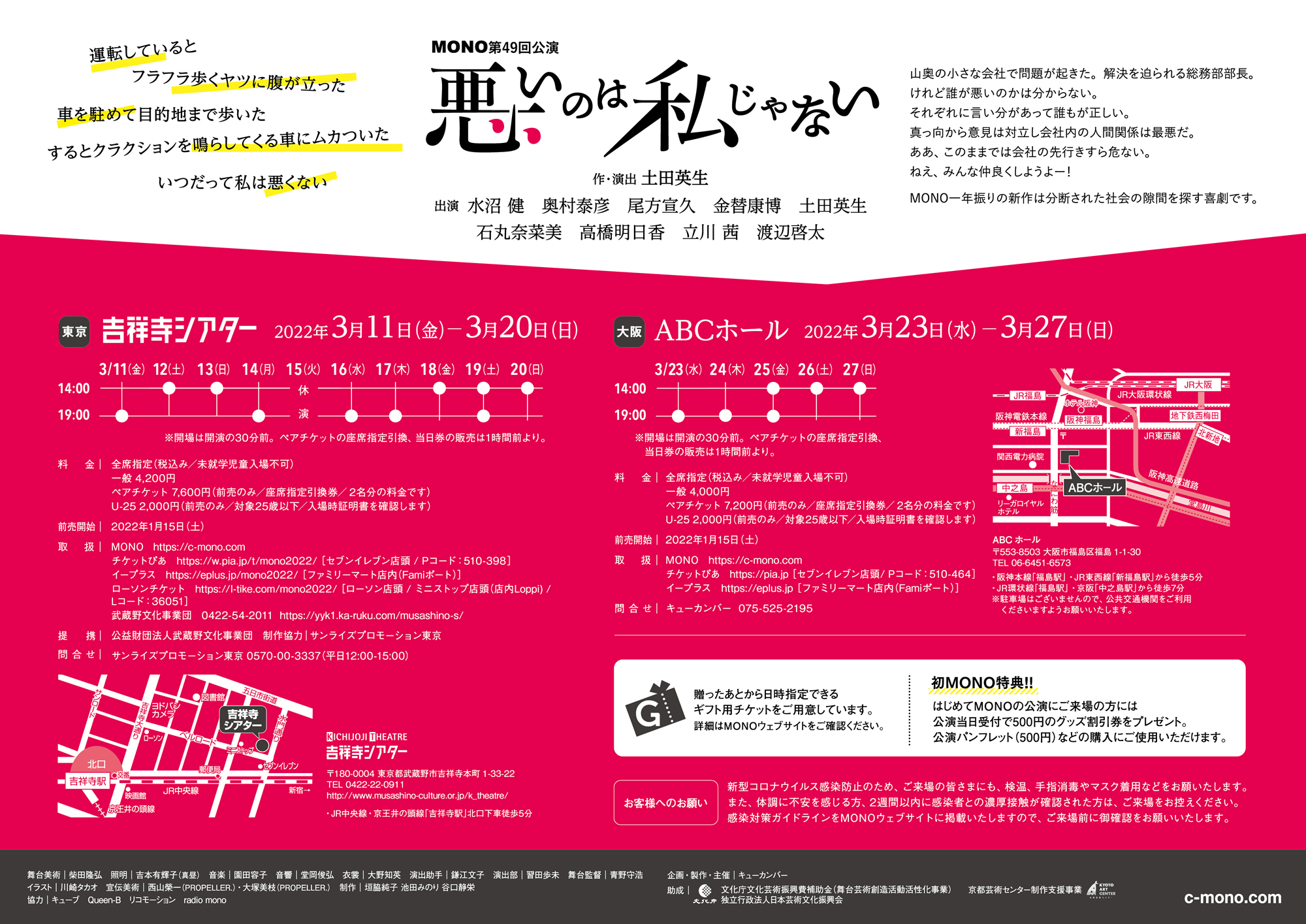 社会の分断が進む中、少しでも光を見られるような作品を創ることを目標にMONOの原点であり得意な会話劇にこだわり、会議室を舞台に何が正しいのかを巡って間抜けで真面目な会話の応酬を描いた。