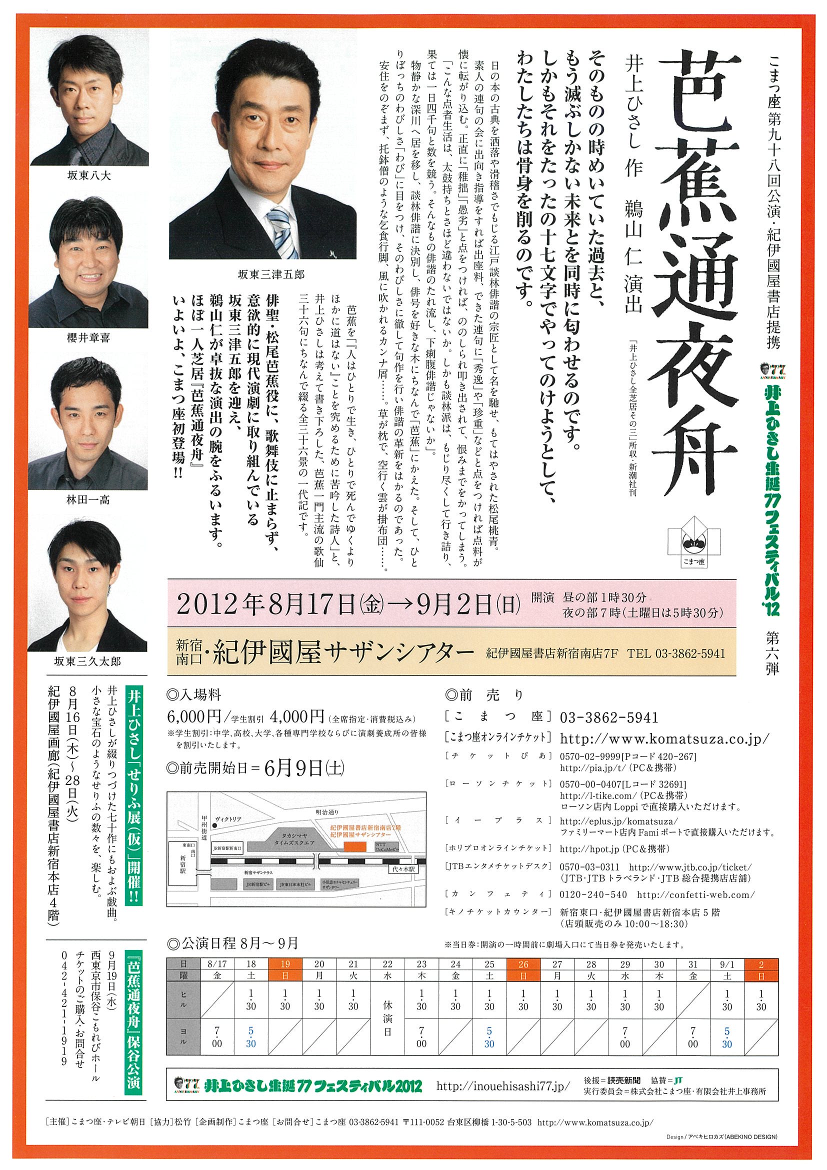 俳聖・松尾芭蕉役に、歌舞伎に止まらず、意欲的に現代演劇に取り組んでいる坂東三津五郎を迎え、鵜山仁が卓抜な演出の腕をふるいます。