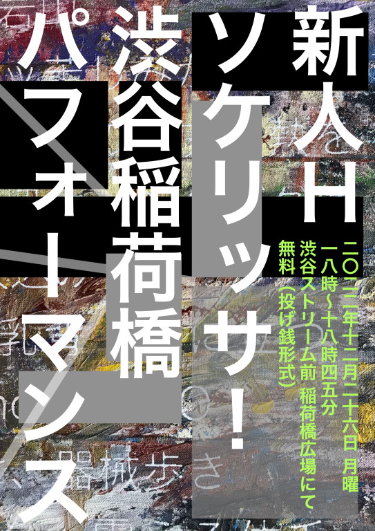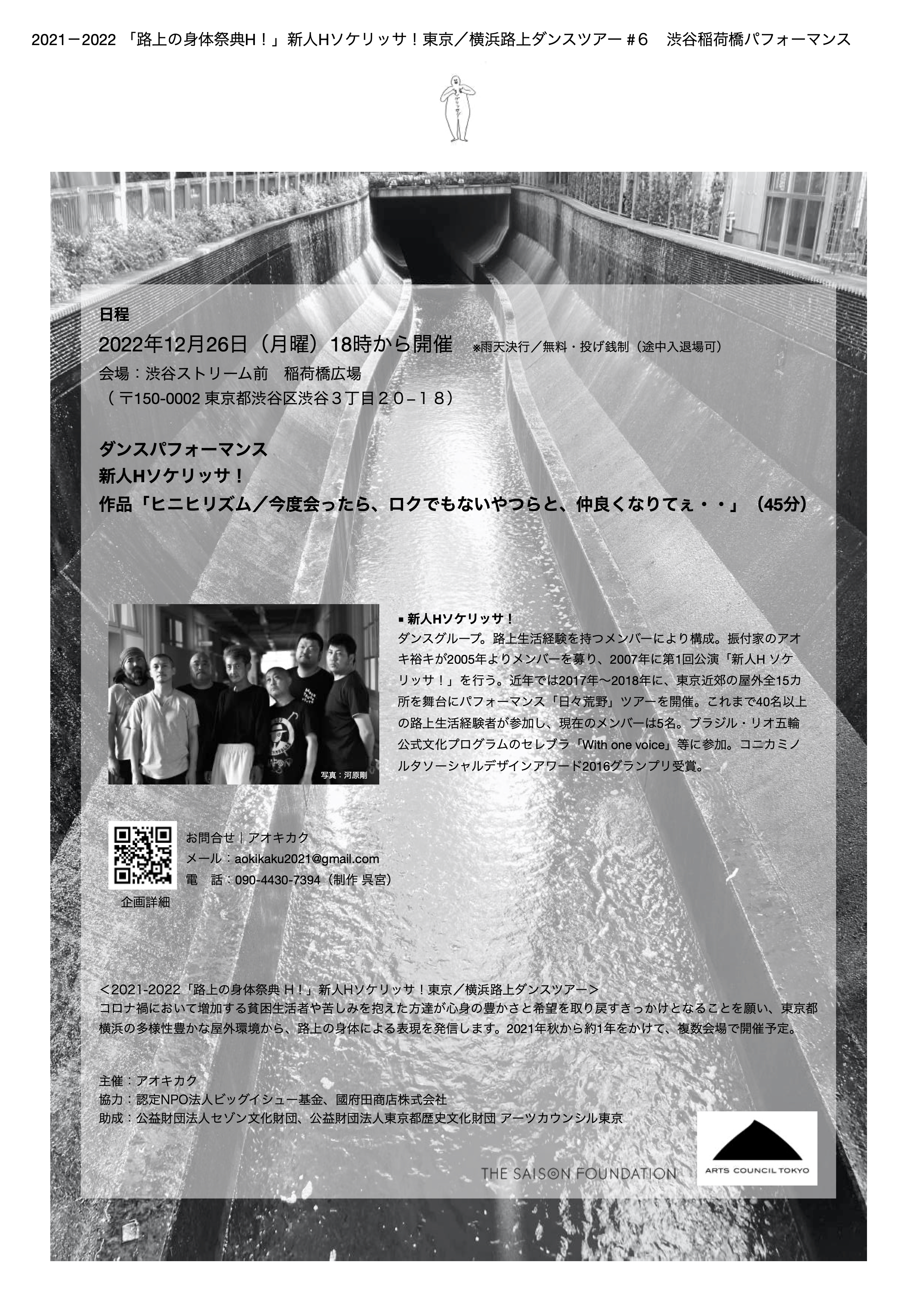「H」は、human(人間)、hope(希望)、homeless(ホームレス)、hurt(痛み)の意。コロナ禍において増加する貧困生活者や苦しみを抱えた方達が心身の豊かさと希望を取り戻すきっかけとなることを願い、横浜・東京の公共空間を主とした8会場で、新人Hソケリッサ!新作ダンスパフォーマンス『ヒニヒリズム/今度会ったらロクでもない奴らと仲良くなりてえ・・』、映画上映、トーク、WS、展示を展開。