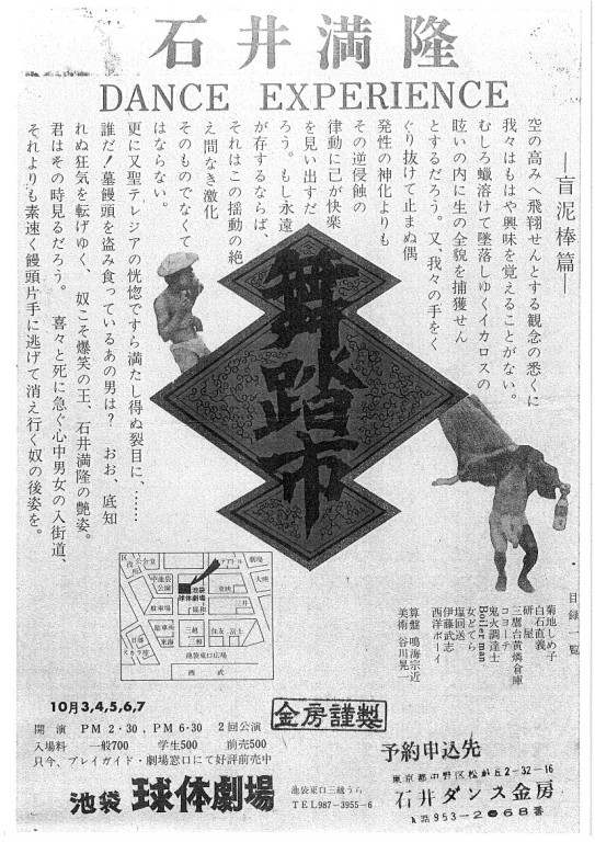 1939年小豆島に生まれる。日本大学芸術学部演劇学科在学中から石井漠にモダンバレエとモダンダンスを学び、東京青年バレエ団に参加。61年から土方巽に師事し「暗黒舞踏派」に参画。71年には、シベリア経由で渡欧し、舞踏家として最も早く海外で活躍した。1980年に帰国してからは、青森県青南病院で日本初の「舞踏療法」を開始するなど、精神医療にも大きな影響を与える。エキセントリックなエピソードにも事欠ず、野草料理を得意とした。主なシリーズ作品に「MU-dance」「自在」など。2017年死去。