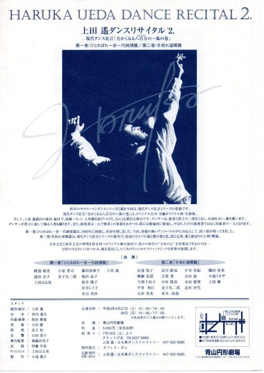 オリジナル台本・全編オリジナル曲・生演奏で送る現代ダンス狂言。演劇、バレエ、人形劇を結びつけ、ダンサーは演者と黒子の二役をこなし、台詞も言えば歌も歌う。道化の狐を進行役に、コミカルでファンタジックに現代日本を描く。前半の第一巻「ひとめぼれ一世一代純情篇」は1995年に初演し好評を博した狐と兎の恋を描く作品の再演。第二巻の新作「冬枯れ望郷篇」では、金満家の狸と庶民の狐との悲喜こもごもを綴る。