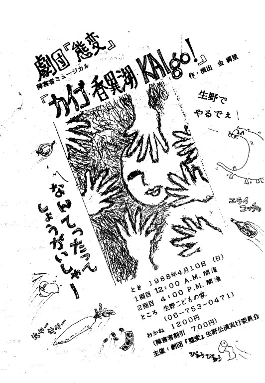 態変旗揚げ作品。とかく世に否定される障害者は、自らに目覚めようとしたときから強烈な自己肯定と自己主張なしにはやってこれなかった。「障害者で何が悪い」と自らの<肉体>に伴う特有の格好、話し方、生活様式そのものを肯定する作業。これは障害者にしかできない自由な発想でなされていいはずだ。障害者が行う肉体表現として、芝居はいい方法ではないか。この初めての試みに人々を巻き込み、態変は劇的なデビューを果たした。