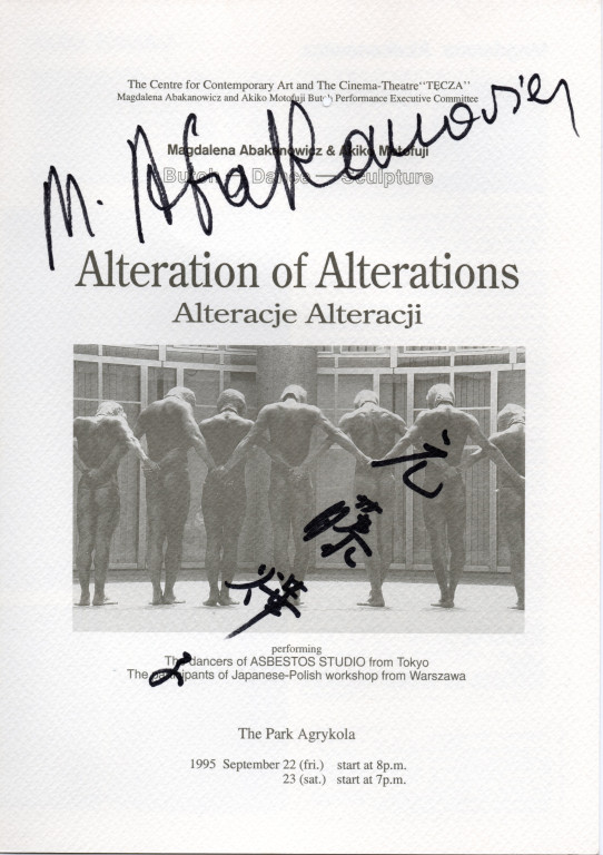 元藤燁子は前年アスベスト館で「アバカノヴィッチへの手紙」を上演。そのアバカノヴィッチと元藤の共同作品が、広島市現代美術館で改訂版として再演。戦争体験をもとに人間存在を問う作品として、同館の被曝50周年記念展のオープニングを飾った。本作は、「沈黙する肉体」のサブタイトルで、アバカノヴィッチの人体彫刻の無名性を舞踏の人体をもって表現しようと、情感を排し裸体で顔を隠した男性舞踏家の群舞で演じられた。
