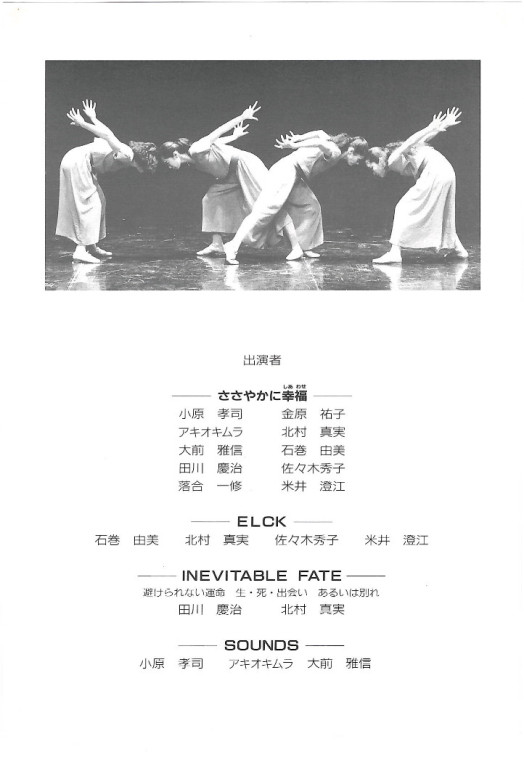 「ささやかに幸福(しあわせ)」は1988年初演。60分。ブレヒトの長編詩に導かれ、5組のカップルが繰り広げる人間模様。世の中、予期せぬことは突然やってくる。せめて今の現実を幸せと思おうではないか。