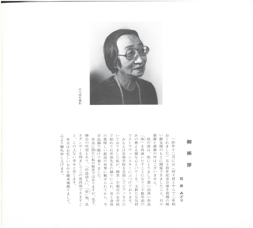 石井みどり(1913-2008)は、1929年現代舞踊創始者・石井漠舞踊研究所に入所。師の相手役として1年目に抜擢されデビューの後、35年 石井みどり舞踊研究所を開設。戦前・戦中・戦後を通して国内外で精力的な公演活動を行い、舞踊家育成にも尽力した。代表作に「祭り太鼓」「ひめゆりの塔」「体」「ブランデンブルグ・コンチェルト」「レクイエム」など多数。著書「よく生きるとは、よく動くこと」草思社(2004年)あり。