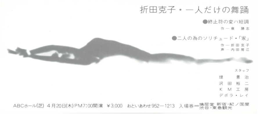 折田克子(1937-2018)は、音楽家折田泉と舞踊家石井みどりの長女で、40年から石井みどりに師事。50年 全国舞踊コンクールで文部大臣賞を最年少で受賞。68年 第2回文化庁芸術家在外研修員に選ばれ1年間渡米。国内外(特に韓国・台湾)で公演活動を行い、韓国からは「大韓民国国民平和統一文化賞」を受賞した。代表作に「憶の市」「パラダイス・ロスト」「夏畑」「裸足のカノン」など多数。石井みどり・折田克子舞踊研究所を主宰した。