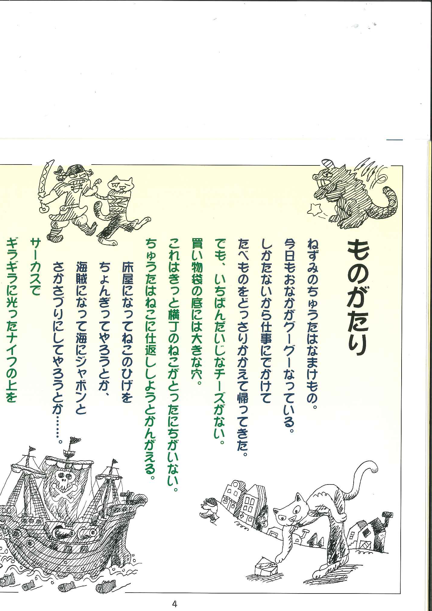 ねずみのちゅうたはなまけもの。いつも寝てばかりいる。おなかがすいて買ってきたチーズをどこかに落としてしまった。どうやら猫が取ったらしい。ねこにどんな仕返しをしてやろうかと考る。床屋になってねこの大事なひげをちょん切ってやろうか、それとも海賊になってねこを海にジャボンとつけてやろうか、それともサーカスでねこに綱渡りをさせてやろうか…。