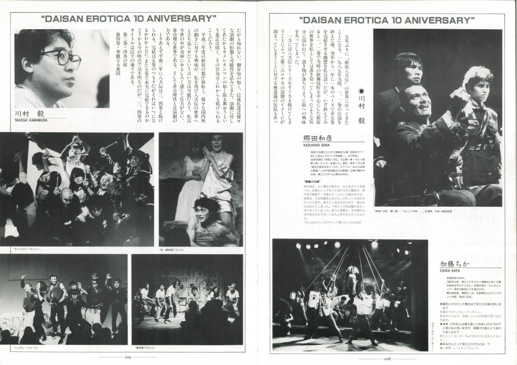 1980年当時明治大学演劇研究部のメンバーを中心に、劇作家・演出家の川村毅が主宰の劇団「第三エロチカ」を創立、2010年30周年に早稲田大学演劇博物館展「第三エロチカの時代1980-2010解散記念展」をもって解散。2002年川村毅新作戯曲プロデュースカンパニー「ティーファクトリー」を設立。