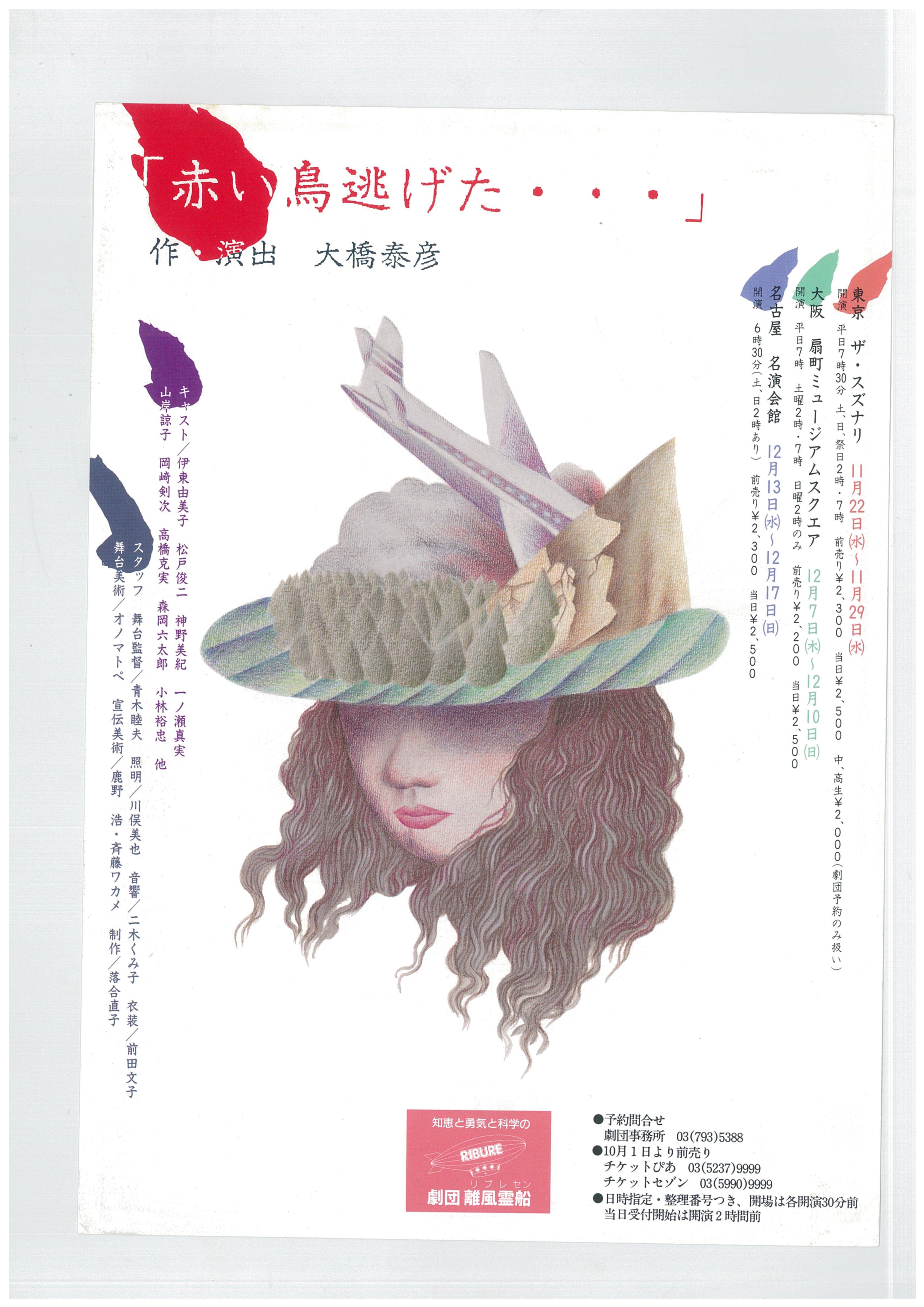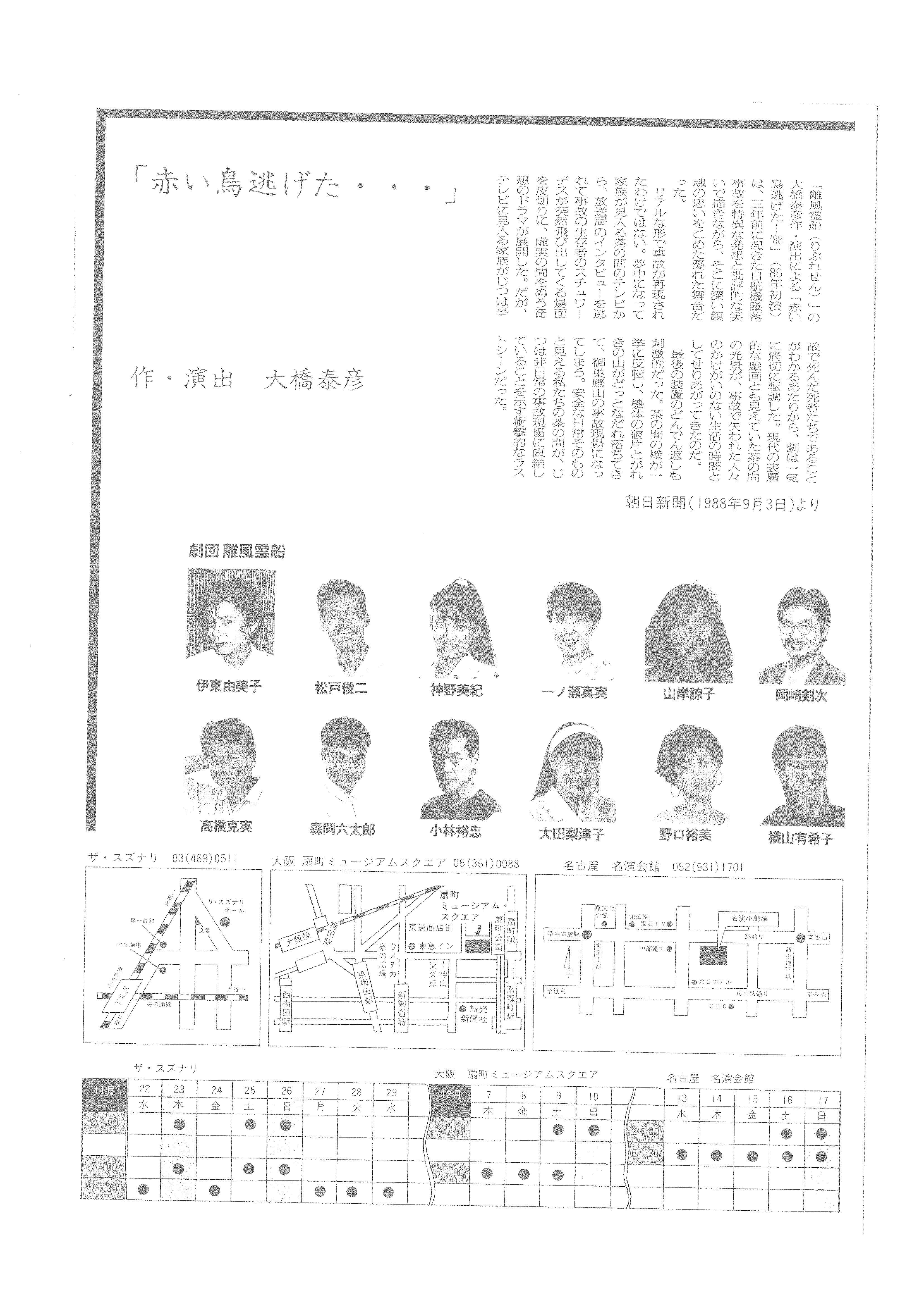 1985年8月に起きた日本航空機の墜落事故を特異な発想と批判的な笑いで描きながら、深い鎮魂の思いを込めた作品。初演は1986年。家族が夢中になって見入るテレビから、インタビューから逃れて事故の生存者であるCAが飛び出してくる場面を皮切りに、日航がコマーシャル界に復帰する撮影現場など、虚実の間をぬう奇想なドラマが展開。やがて現代の表層的な戯画である茶の間の光景が、事故で失われた人々のかけがえのない生活の時間としてせりあがってくる。ラスシーンのどんでん返しで、日常の茶の間が、非日常の事故現場に直結していることを表現している。