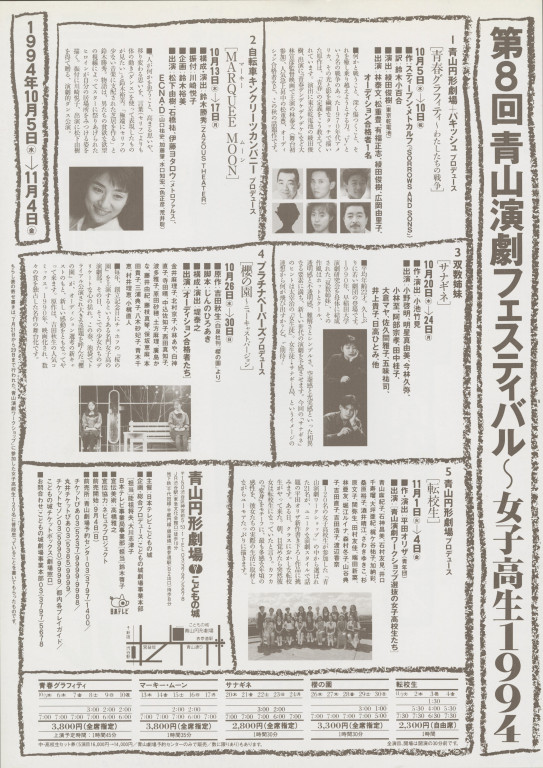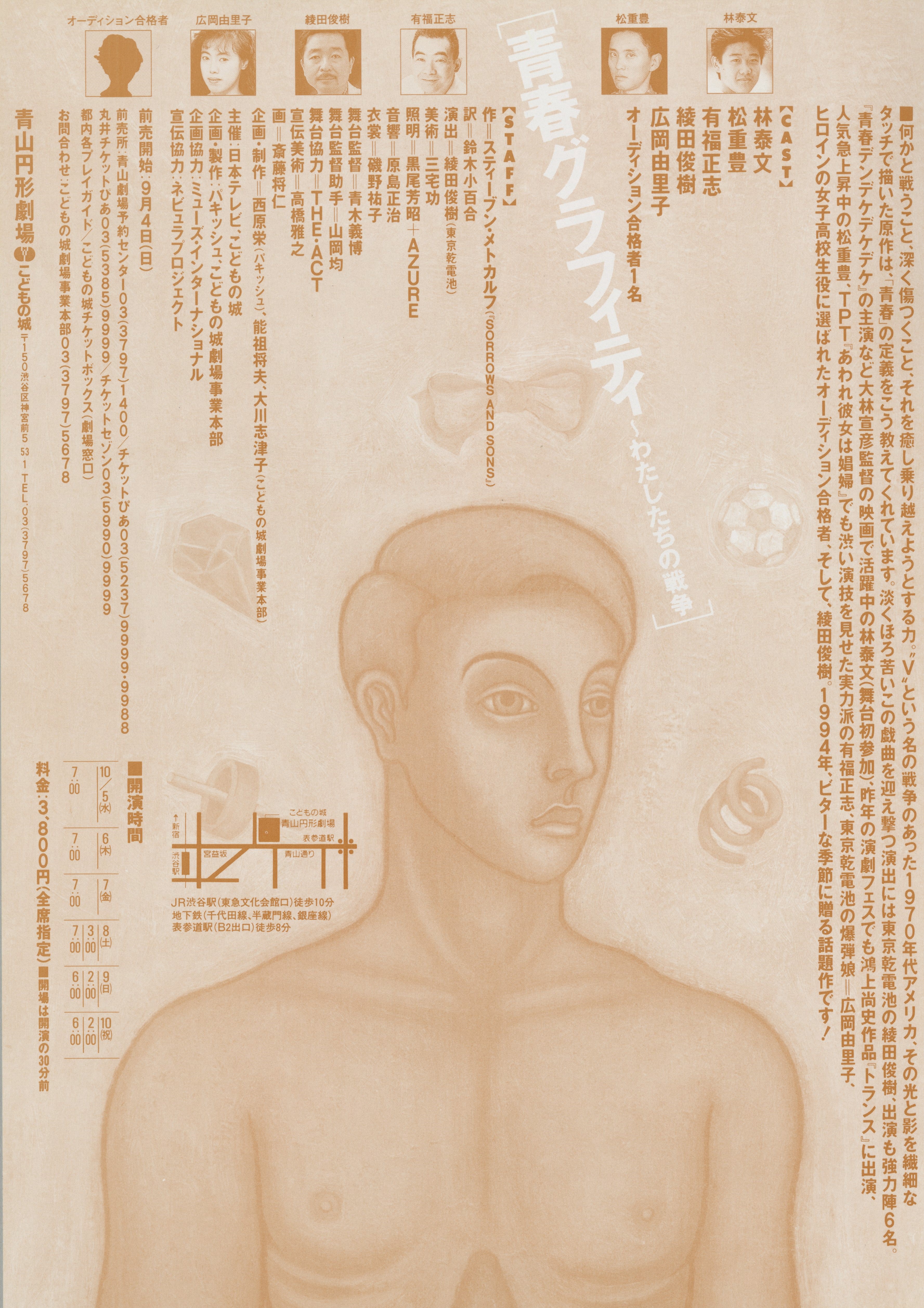 (フライヤーより)何かと戦うこと、深く傷つくこと、それを癒し乗り越えようとする力。“V”という名の戦争のあった1970年代アメリカ、その光と影を繊細なタッチで描いた原作は、「青春」の定義をこう教えてくれています。淡くほろ苦いこの戯曲を迎え撃つ演出には東京乾電池の綾田俊樹、出演も強力陣6名。『青春デンデケデケデケ』の主演など大林宣彦監督の映画で活躍中の林泰文(舞台初参加)、昨年の演劇フェスでも鴻上尚史作品『トランス』に出演、人気急上昇中の松重豊、TPT『あわれ彼女は娼婦』でも渋い演技を見せた実力派の有福正志、東京乾電池の爆弾娘=広岡由里子、ヒロインの女子高校生役に選ばれたオーディション合格者、そして、綾田俊樹。1994年、ビターな季節に贈る話題作です!